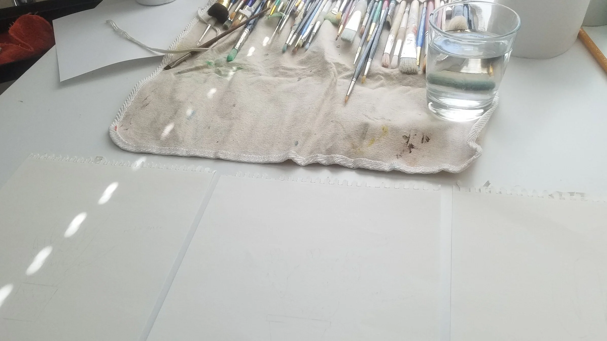 I drew these three pieces to match the style of print on the shower curtain. Just a rough, barely-visible sketch does the trick when you are working with watercolors. The magic happens when you add the paint. It brings these poor plants to life!